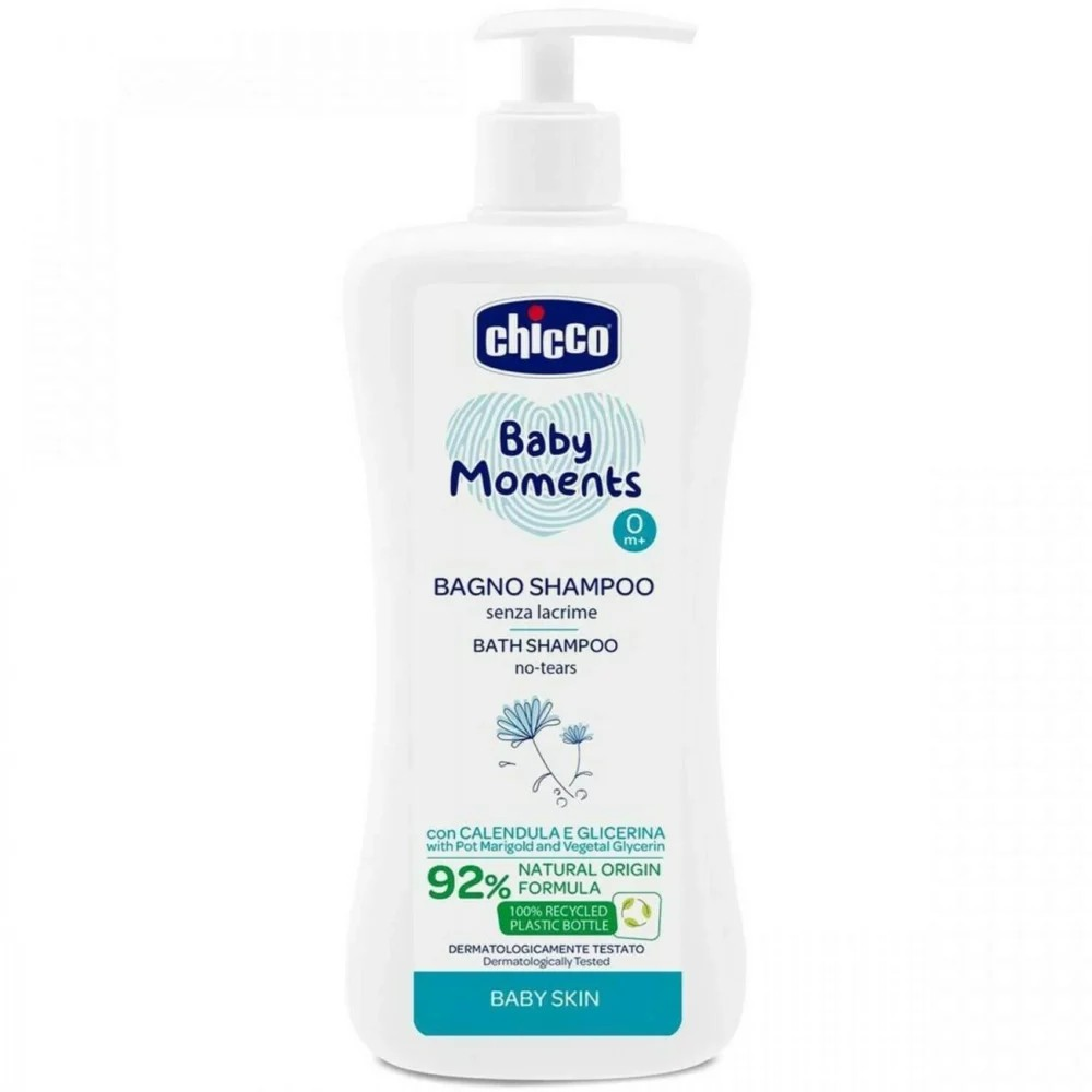 Testé dermatologiquement et ophtalmologiquement, Chicco Bath Shampoo Baby Moments est enrichi en extrait de calendula et en glycérine végétale.